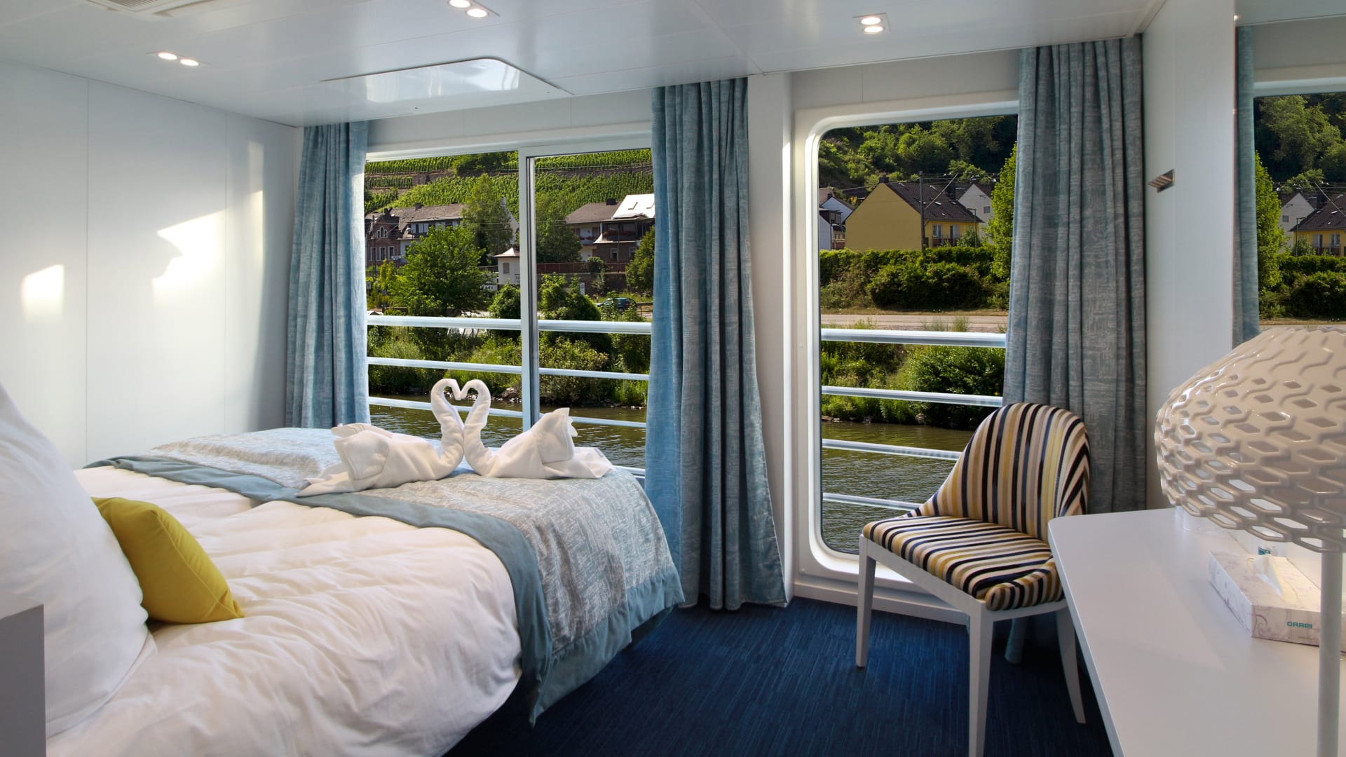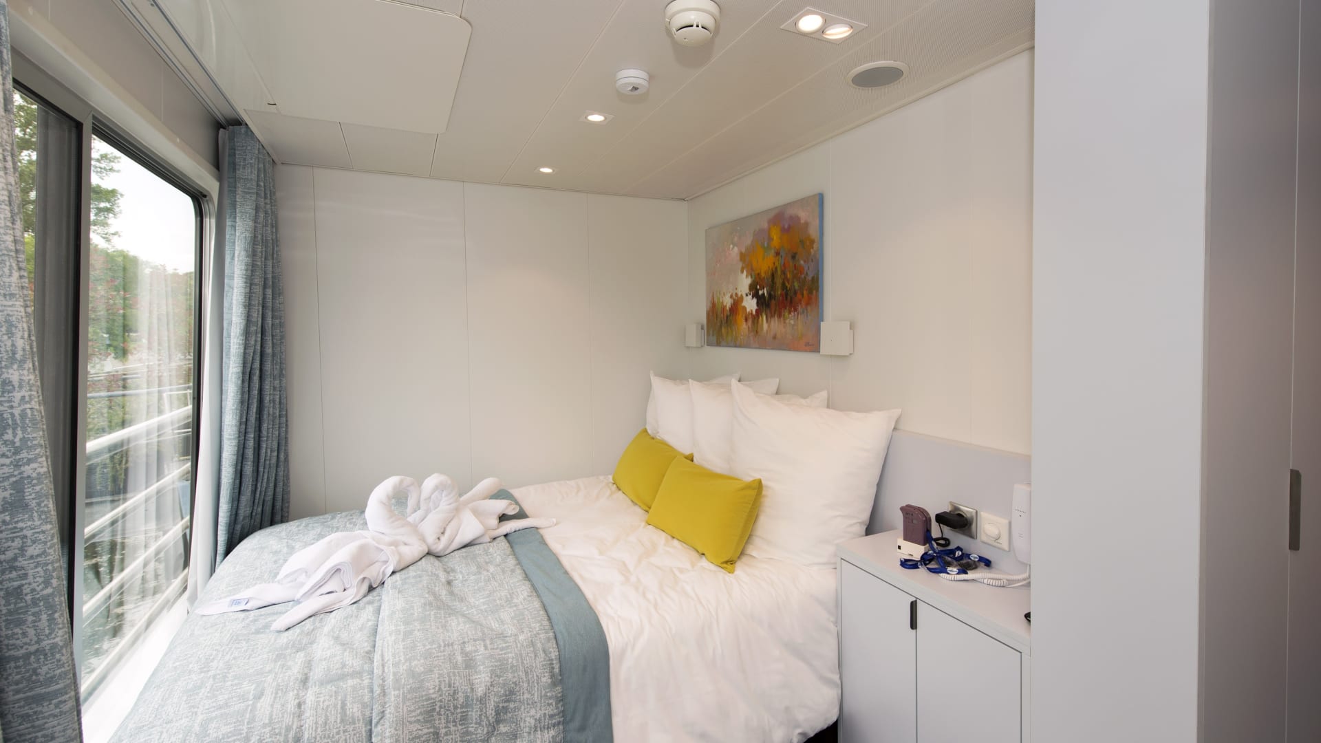 Rymlig hytt med stort öppningsbart fönster & fransk balkong, separata sängar & badrum med dusch. Hytten är utrustad med TV, värdeskåp, WiFi, hårfön & garderob.
