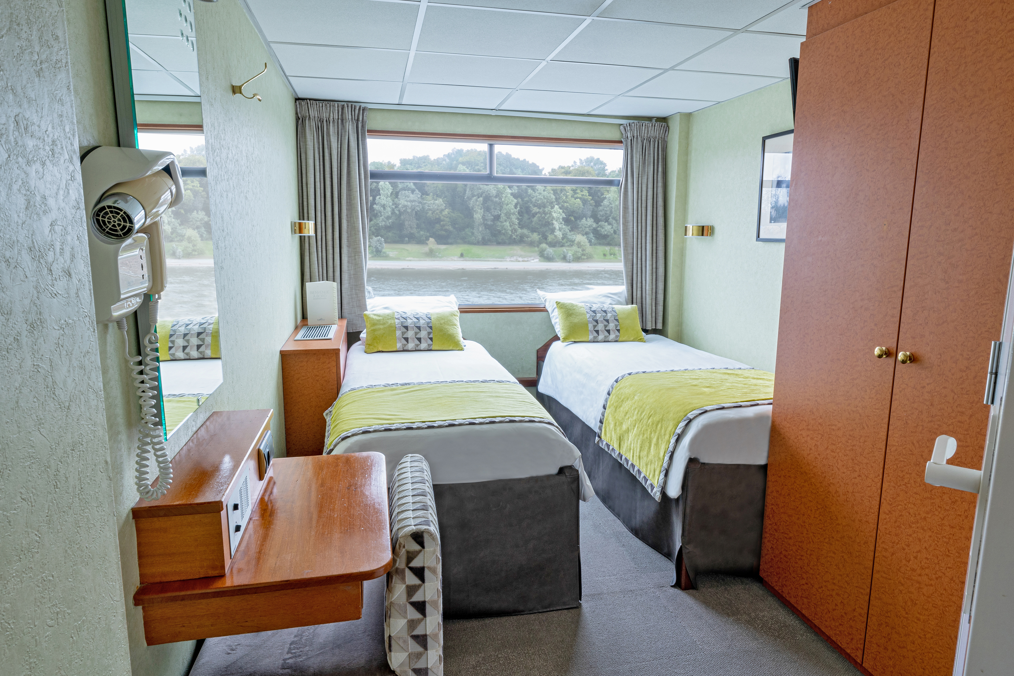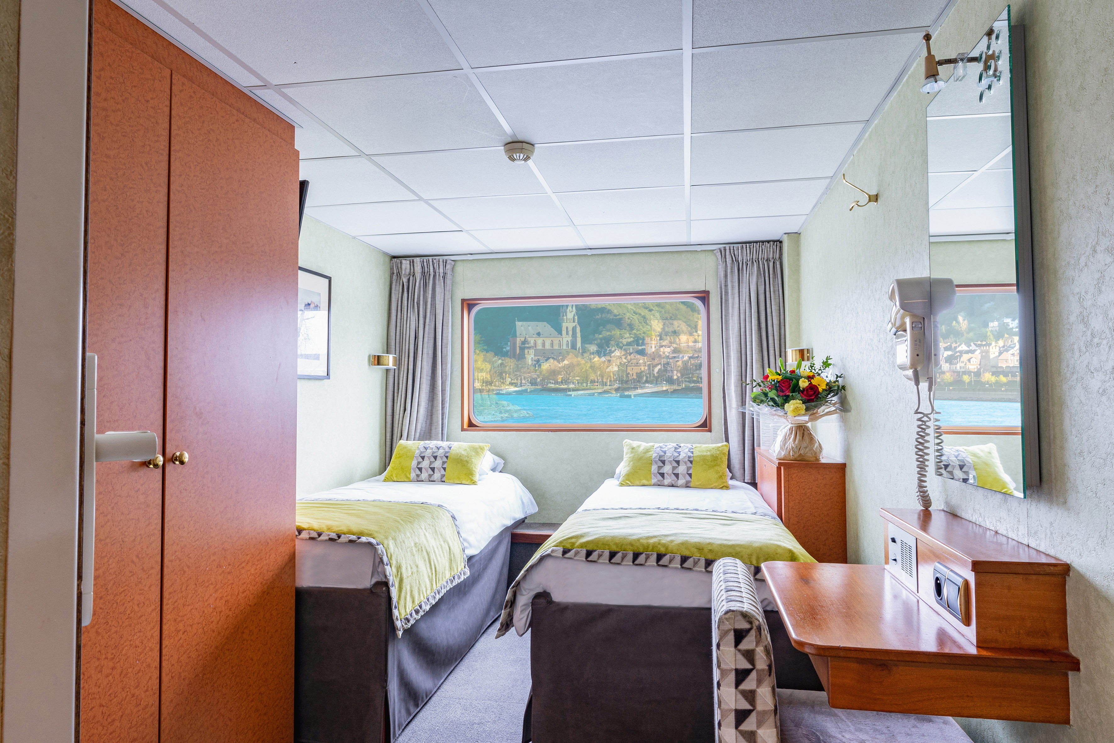 Hytt med stort fönster, separata sängar & badrum med dusch. Hytten är utrustad med TV, värdeskåp, WiFi, hårfön & garderob.