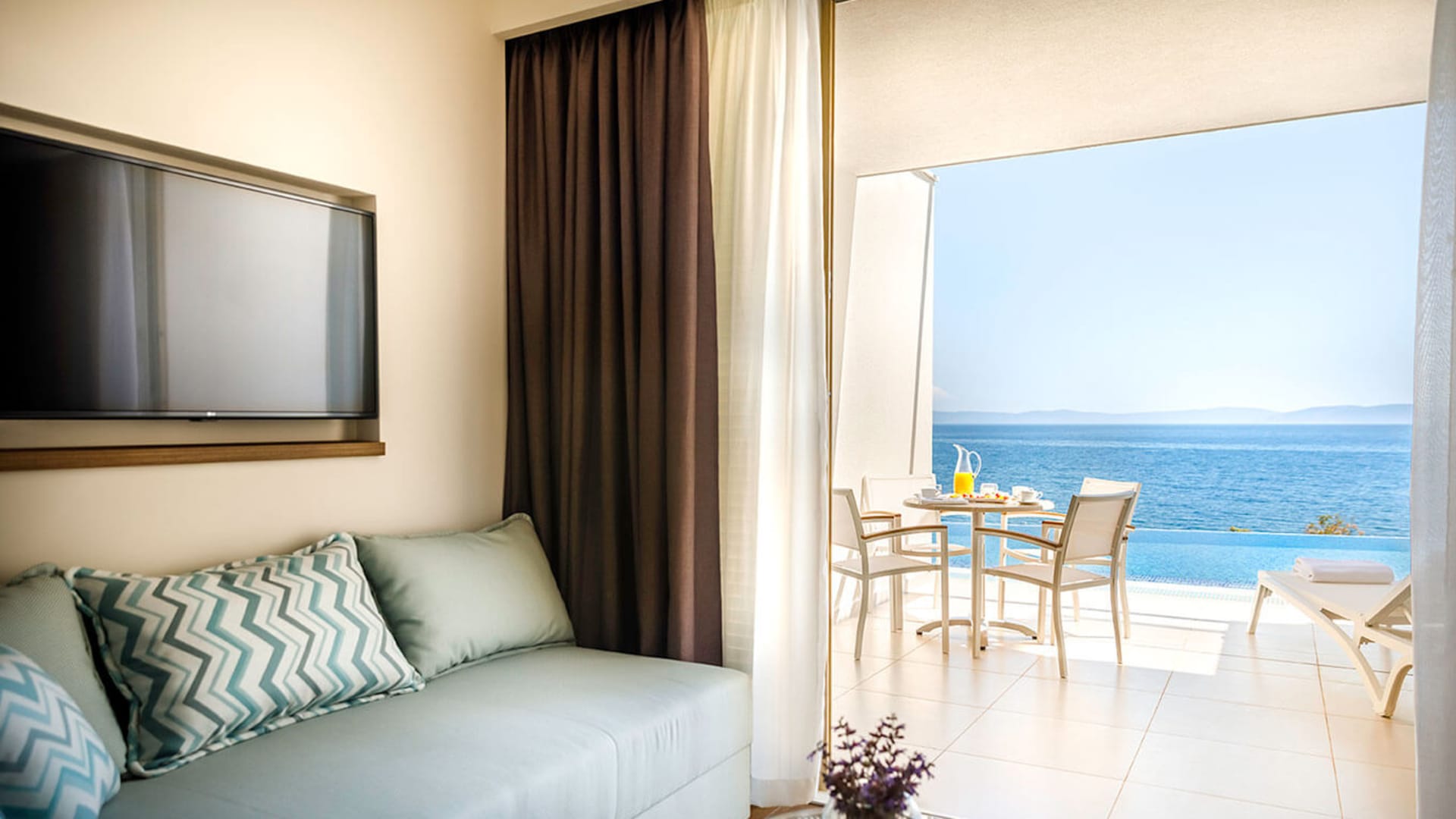 Moderna standardrum (ca 21–28 m²), med luftkonditionering, satellit‑TV, minibar, säkerhetsskåp och gratis Wi‑Fi. De flesta rum har balkong och havs‑ eller trädgårdsutsikt